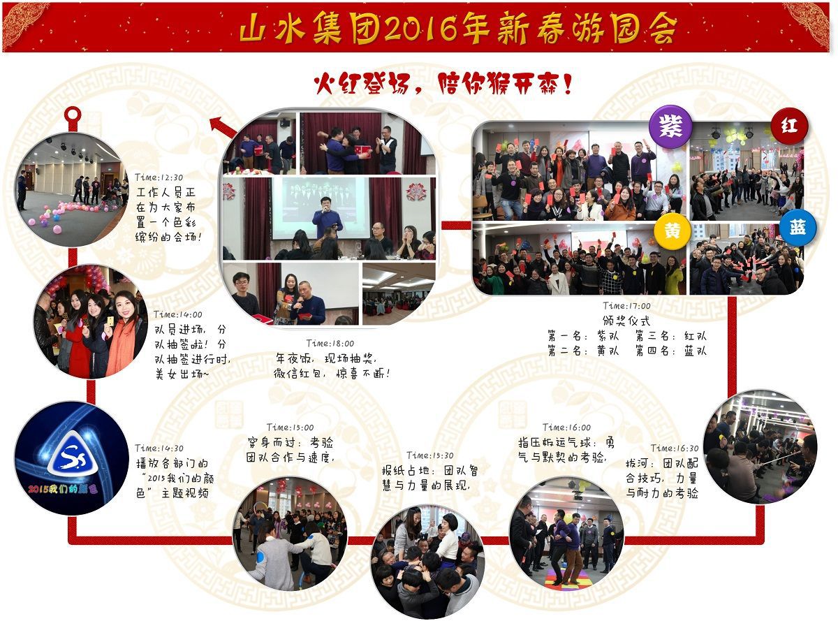 本次游园会山水人用竞技超越自我,用行动证明力量,大家所展现的激情和实力,使成绩都变得次要,相信山水有这么一支团队必定会蒸蒸日上,而这样的团队在山水的亚洲体育官网也势必会发挥更大的实力。本次竞技结束后各组队员都领取到了游园红包和工会发放的拜年礼品,带着收获和喜悦,意犹未尽的赶赴山水集团2015年夜饭现场。
