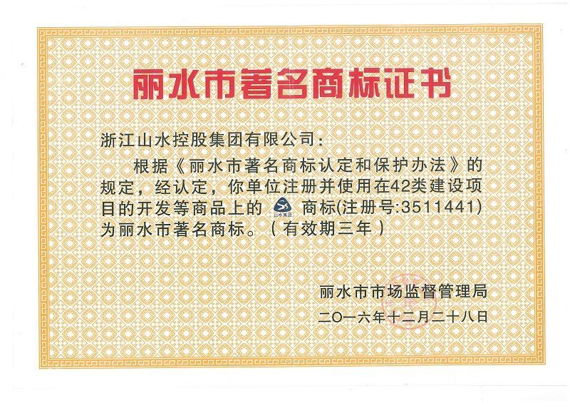 成功申报著名商标标志着一个企业的品牌建设优良,信誉度高,市场前景良好,而且其注册商标被公众广泛知晓,享有较高的市场声誉,代表着一个企业的经济实力和市场占有率。此次被认定为丽水市著名商标,是对山水集团多年来的品牌建设,在丽水市业界良好口碑和信誉打造的肯定与支持,将进一步提升企业的品牌形象,增强山水集团的识别度,得到社会的熟知和信赖。