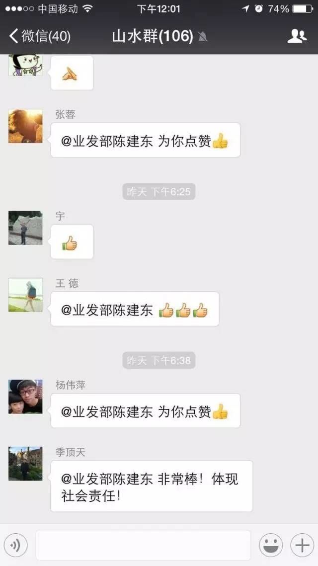 该消息在一些微信群传开后,引发了一波波点赞潮!山水集团董事长也第一时间@陈建东 “非常棒!体现社会责任!”