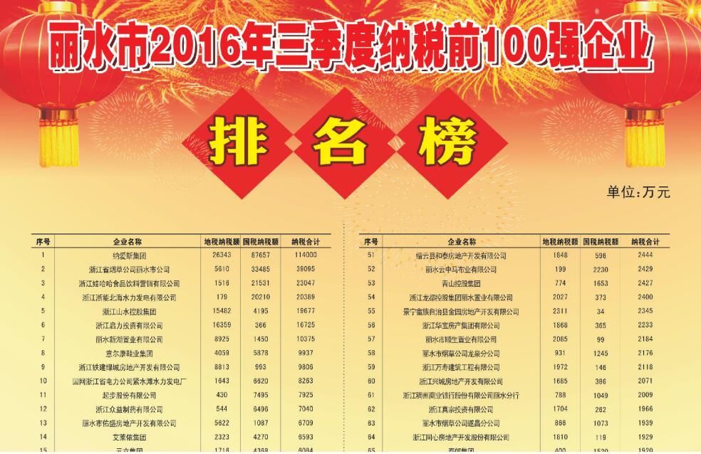 日前,丽水市2016年三季度纳税前100强企业排名更新。三季度亚洲体育官网(简称“山水集团”)综合纳税金额合计19677万元,在丽水市2016年三季度纳税前100强企业中位列第五名。此次是山水集团首次进入丽水市纳税前五名,能力越大,责任越大,集团董事长季顶天曾说,山水集团的目标是:为社会、为员工、为股东创造更大的价值,实现社会、企业、个人和谐共赢发展。作为纳税大户,山水集团将再接再厉,为丽水市经济发展贡献自己的一份力。