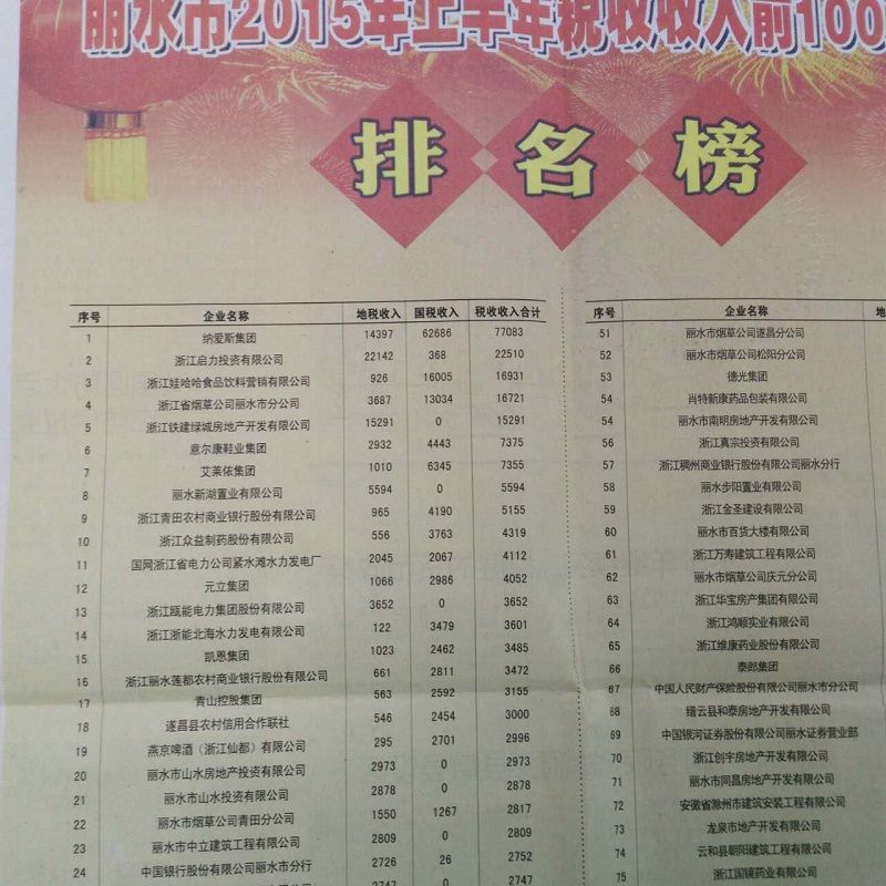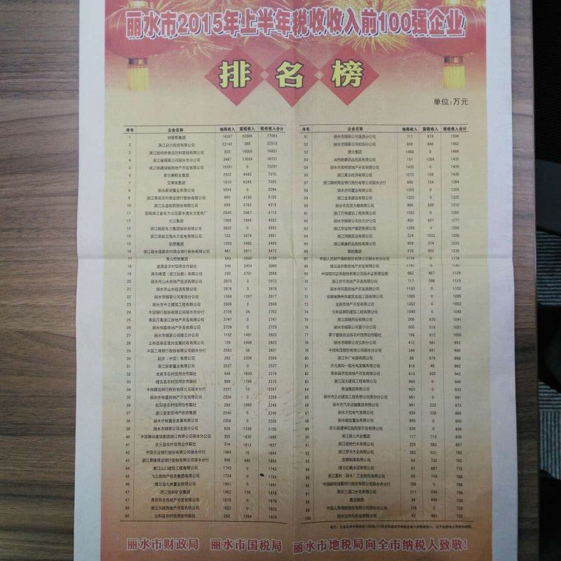 山水集团旗下两家公司荣登丽水市2015年上半年税收收入前100强企业榜单