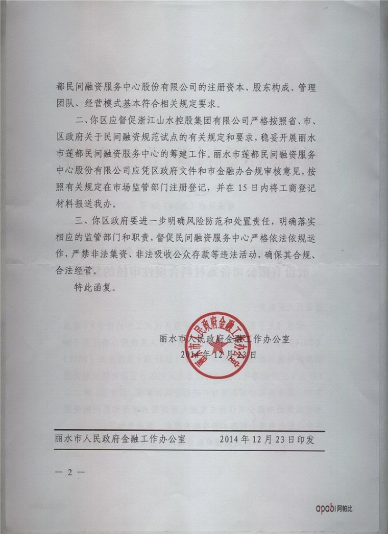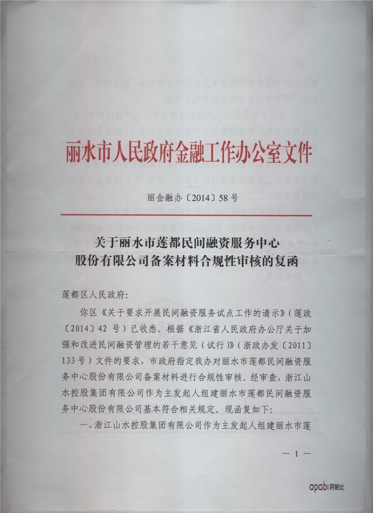 12月31日,经过两年多的沟通与协商,由山水集团作为主发起人成立的丽水市莲都民间服务中心股份有限公司终于获得丽水市金融办批文,顺利取得该公司的营业执照,标志着山水集团向金融服务业转型发展又迈出了重要的一步,为山水集团的整个转型目标奠定了坚实的基础。