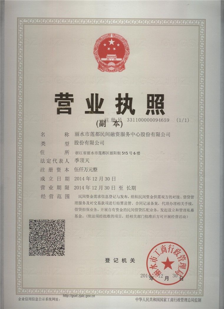 丽水市莲都民间服务中心股份有限公司由亚洲体育官网、丽水市绿谷明珠大酒店集团有限公司、丽水市处州混凝土有限公司、浙江依莱特纺织有限公司和浙江中新力合控股有限公司共同出资成立的一家股份制有限公司,中心从事民间资金需求信息登记与发布,组织民间资金供需双方的对接、借贷管理服务及对交易款项进行结算监管、合同记录备案,代理办理相关手续,借贷担保业务,开展自有资金的民间借贷匹配业务,发起设立和管理私募基金。
