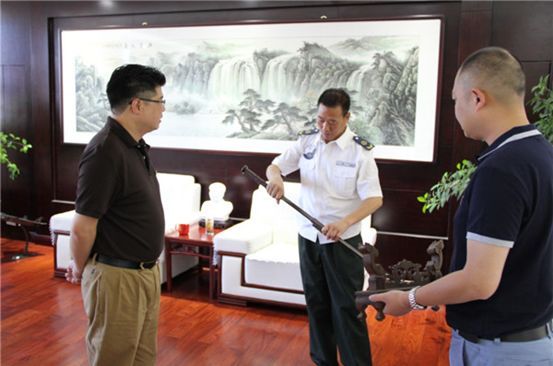 季董(左一)给刘主席(中)送上龙泉宝剑