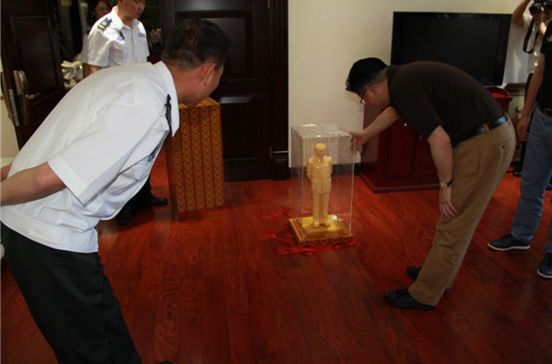接着,山水集团为吉运集团送上了丽水三宝中的两宝——龙泉宝剑与龙泉青瓷,“自古宝剑赠英雄,刘主席就是我心目中的英雄”,季董如是说道。吉运集团也回赠了他们精心准备的礼物——金质毛主席雕像。